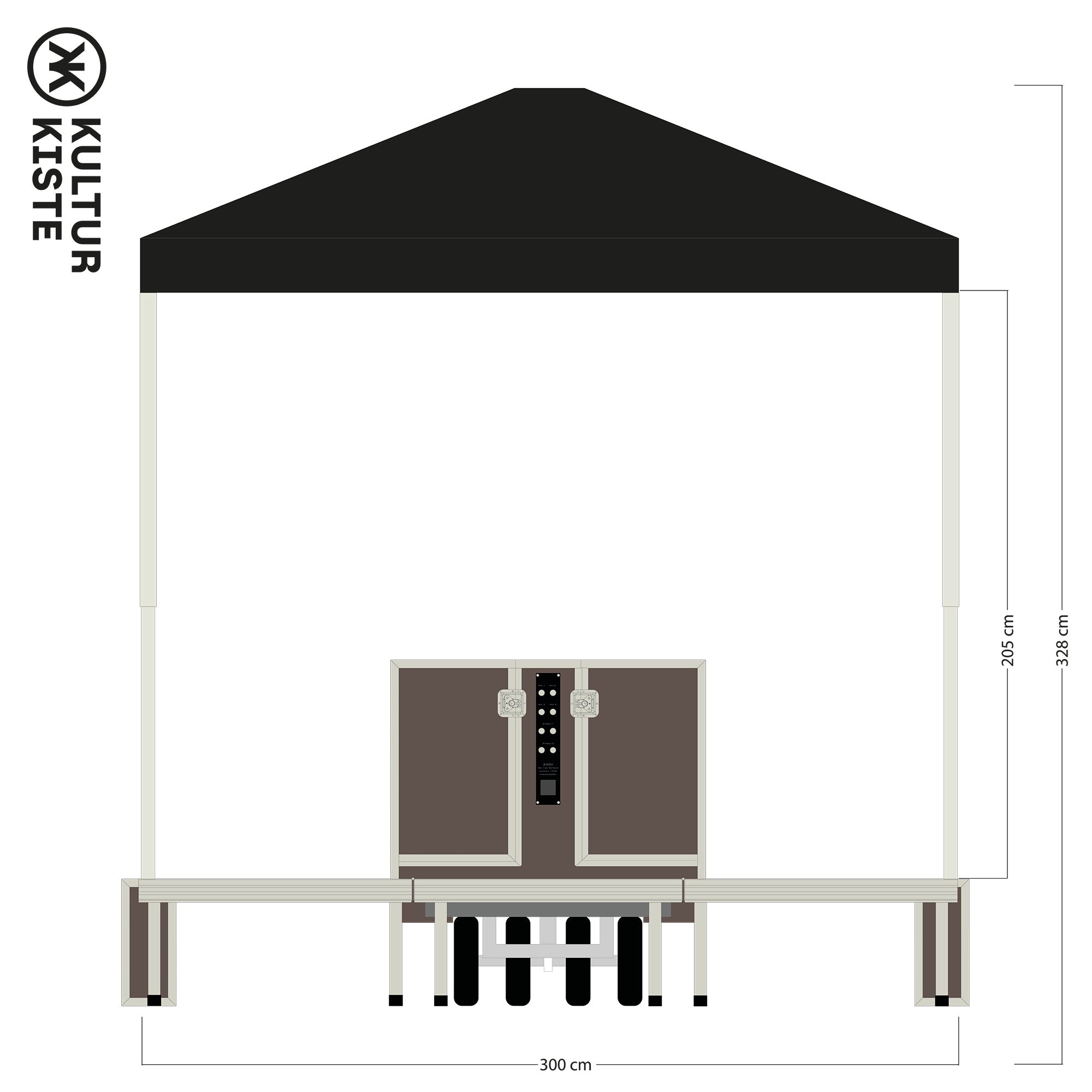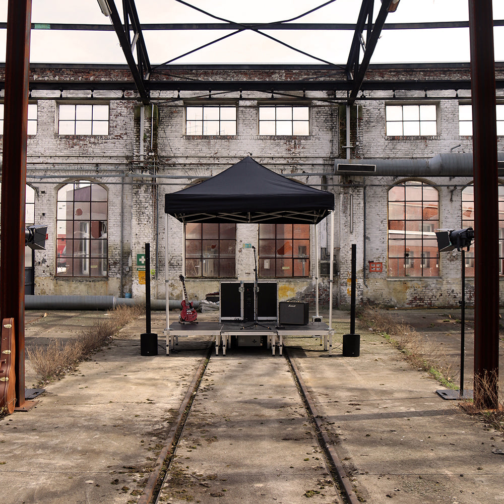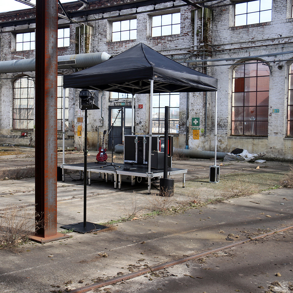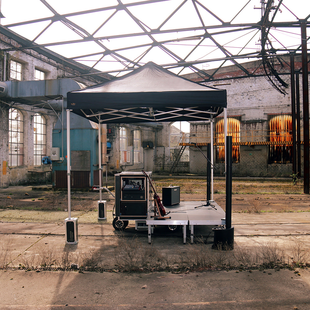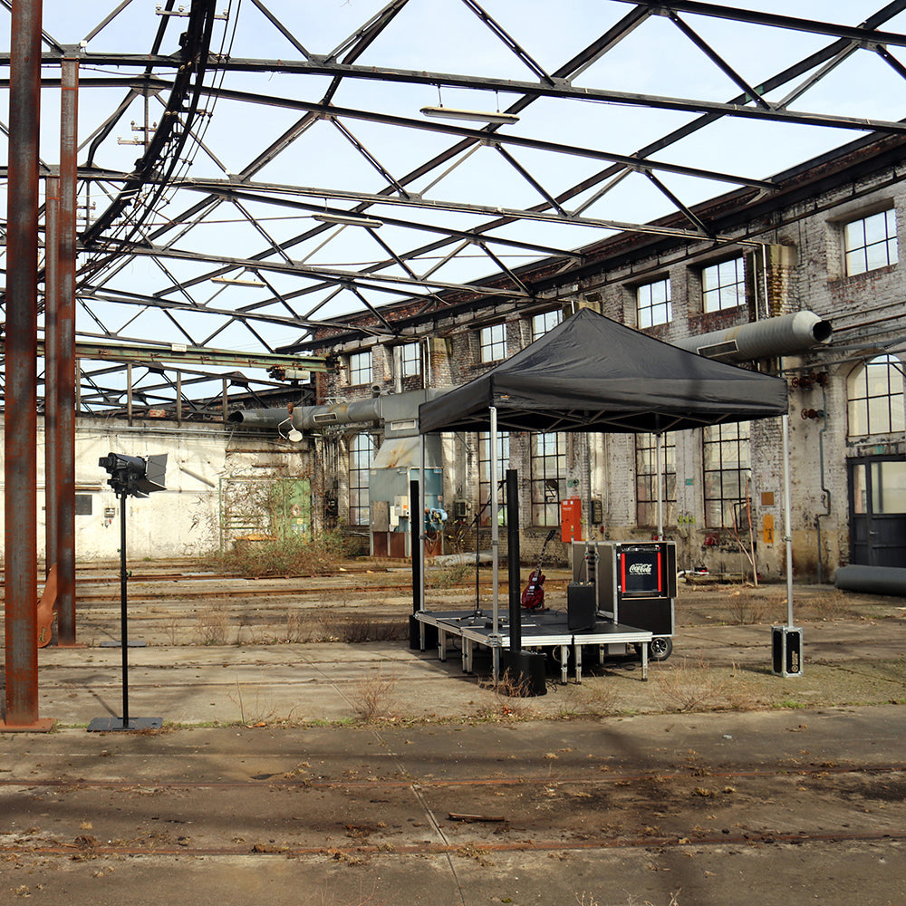 Der komplette Aufbau dauert – je nach Modell – etwa 15–20 Minuten und kann von einer einzelnen Person durchgeführt werden. Bühne, Technik und Verkabelung sind bereits vorbereitet.