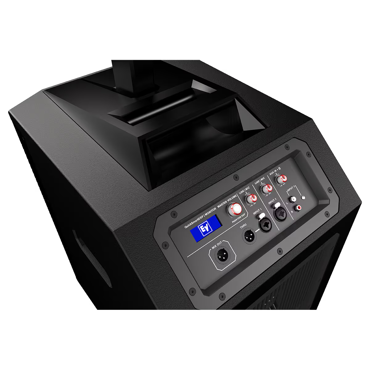 Dank integriertem QuickSmartDSP, vier Betriebs-Presets (Music, Live, Speech, Club), drei-Band-EQ, Delay-Funktion und Bluetooth®-Streaming über die App wird der Aufbau unkompliziert, der Sound direkt einsatzbereit.
